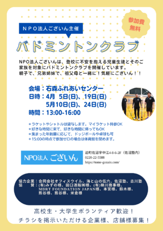 NPO法人ございんは、登校に不安を抱える児童生徒とそのご家族を対象にバドミントンクラブを開催しています。