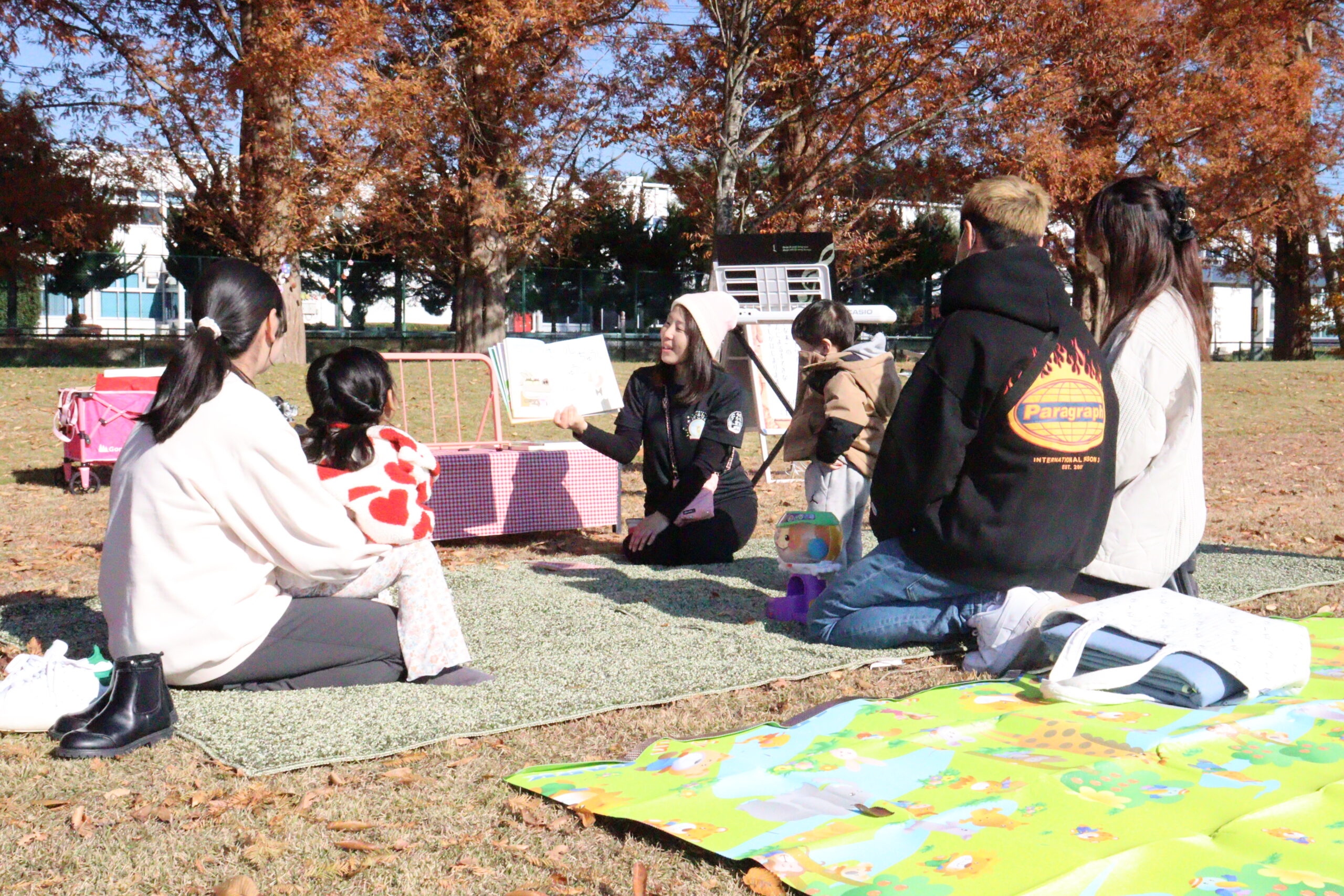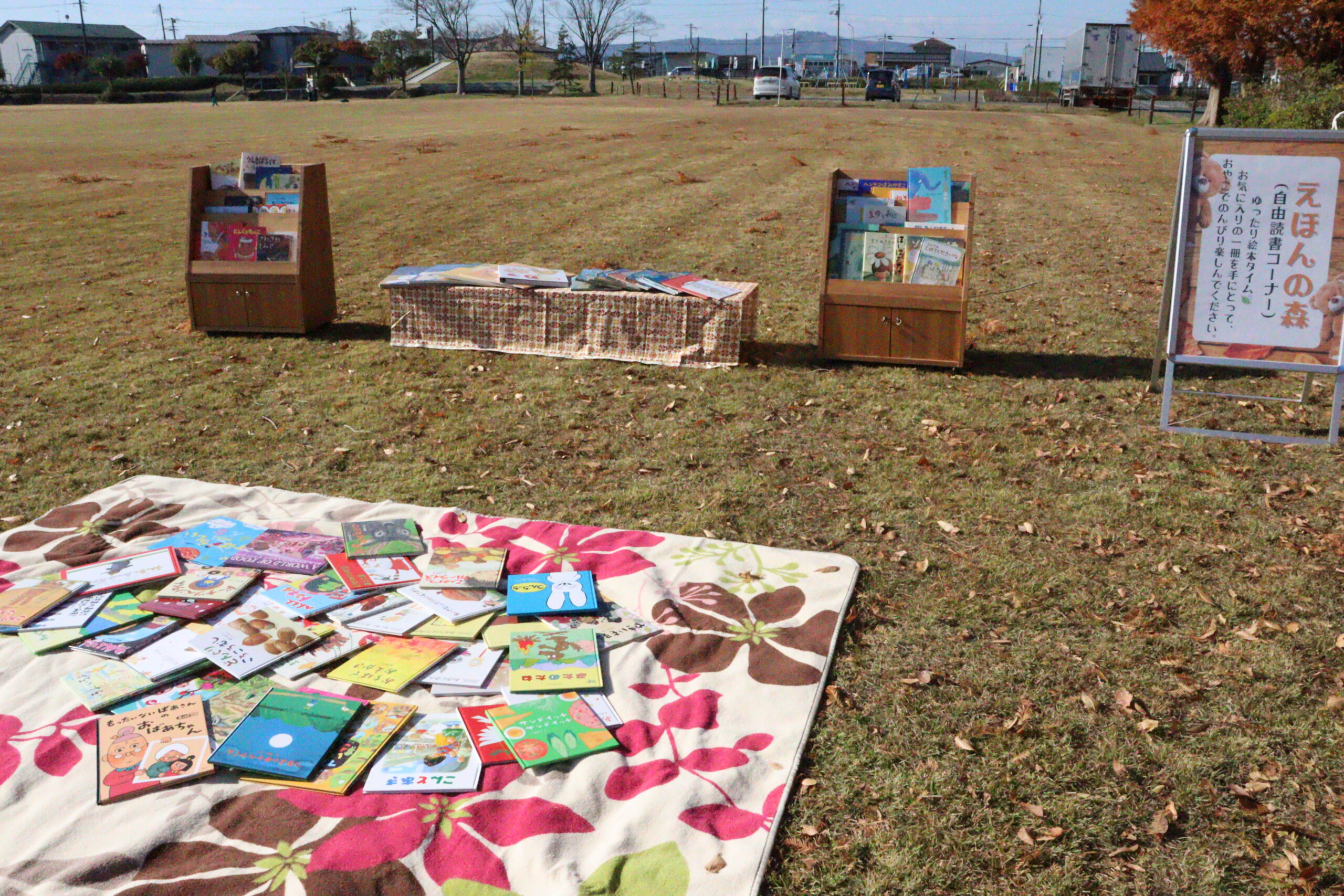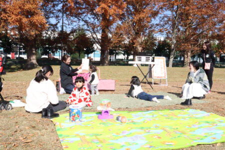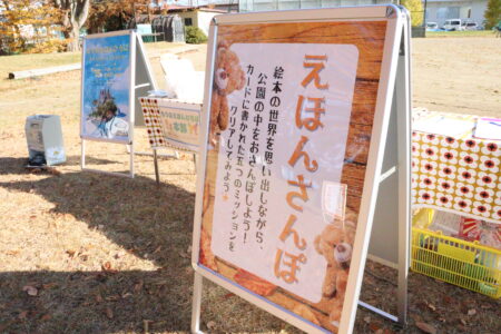 親子で自然を感じながら、外でのびのびと過ごしてもらいたいとの思いから、公園にはたくさんの絵本が並び、好きな絵本を自由に読める「えほんの森」をはじめ、読み聞かせサークル「おおきな木」の皆さんによる読み聞かせタイムも行われました。秋の食べ物などを題材にした紙芝居や読み聞かせが披露され、訪れた親子は秋の雰囲気をたっぷりと楽しんでいました。